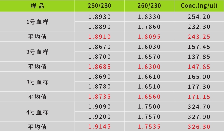 同一批次試劑提取不同血樣的實驗結(jié)果